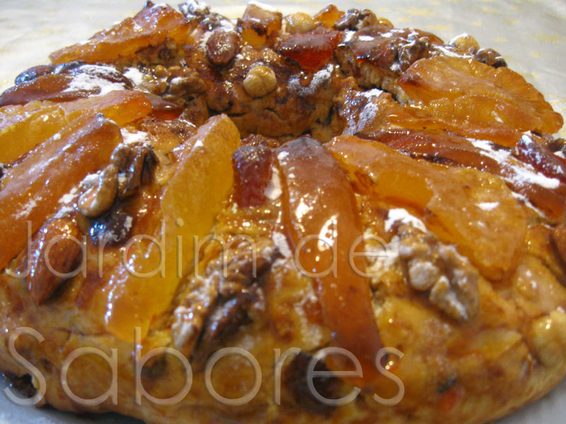 Dilua o fermento no leite morno. Junte 50 g de farinha e misture bem. Cubra com película aderente e deixe levedar durante 15 a 20 minutos até duplicar de volume e formar bolhas. Misture as sultanas com o vinho do Porto e deixe macerar durante alguns minutos. Misture a margarina com o açúcar, as raspas de limão e de laranja e o aroma de baunilha até obter uma mistura cremosa e esbranquiçada. Junte os ovos e misture. Adicione a mistura do fermento e a farinha misturada com o sal e amasse bem. Adicione o vinho e as sultanas e os restantes frutos secos e amasse bem durante alguns minutos. Forme uma bola e polvilhe-a com farinha. Tape com película aderente e deixe levedar num local temperado durante 1 hora e 30 minutos até duplicar de volume. Amasse durante alguns minutos. Forme um rolo e una os dois extremos. Coloque-o num tabuleiro sobre uma folha de papel vegetal. Dilua a gema num pouco de água e pincele a superfície da massa. Decore com os frutos secos. Deixe levedar durante cerca de 1 hora e 30 minutos. Cozinhe em forno pré-aquecido a 180º durante cerca de 25 minutos. Deixe arrefecer, pincele com geleia e polvilhe com açúcar em pó.