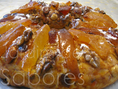 1 gema * 1 colher de sopa de água * geleia de marmelo * frutos secos variados (nozes, amêndoas, avelãs, ananás, morangos, papaia, manga) * açúcar em pó